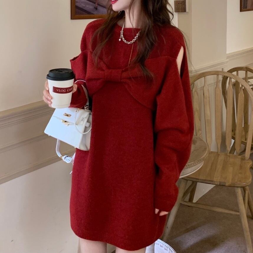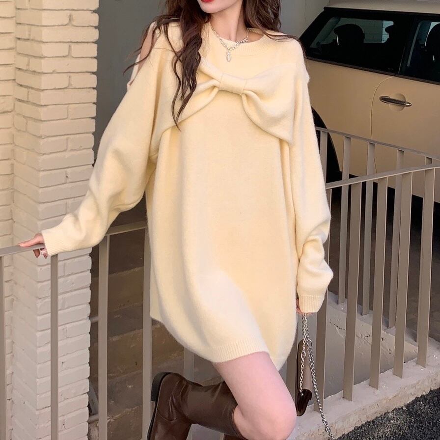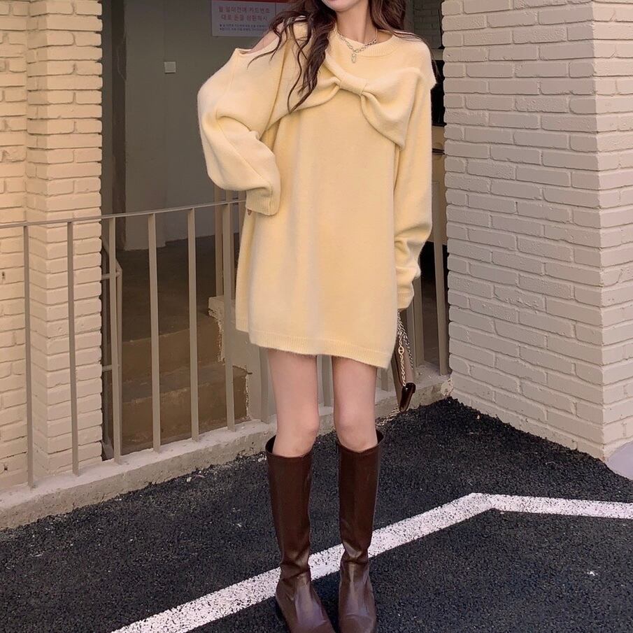 【FREE,2color】フロント リボン 肩あき ワンピース a081