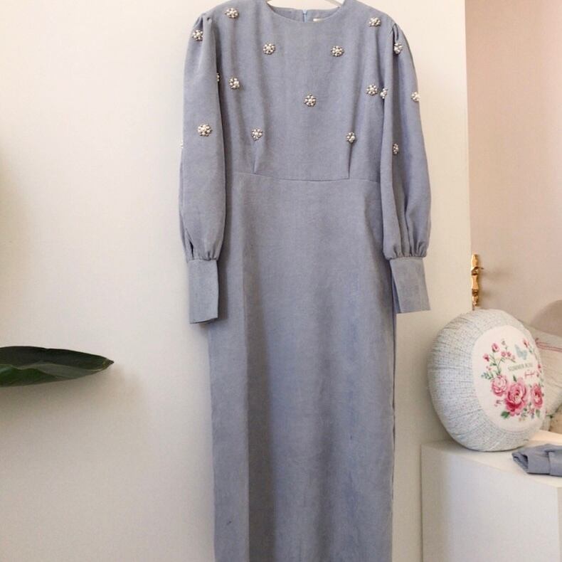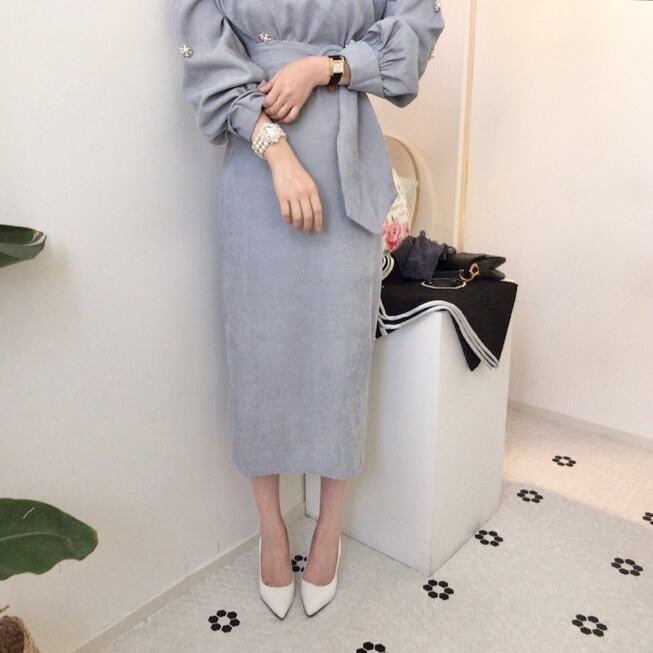【S~L,2color】コーデュロイ クルーネック ポイントビジュー ワンピース a103